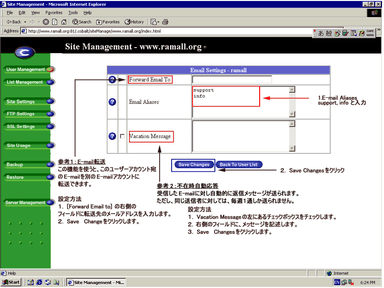 1:.Email Aliases(登録したいemail address)にsupport,infoと入力します。